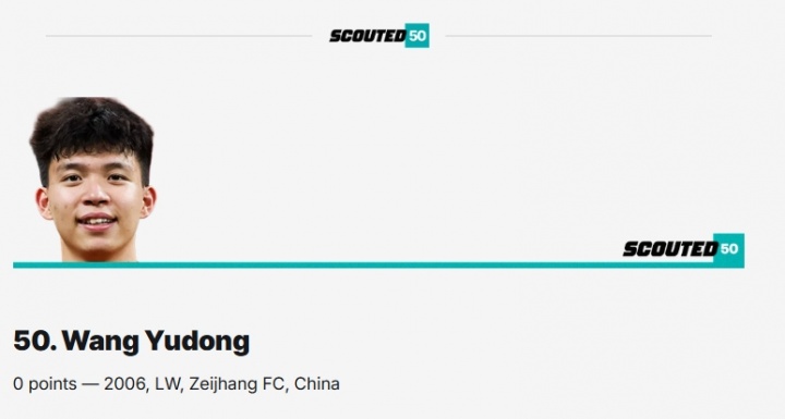 排面18岁王钰栋入围外媒SCOUTED年度全球50大新星,排名第50